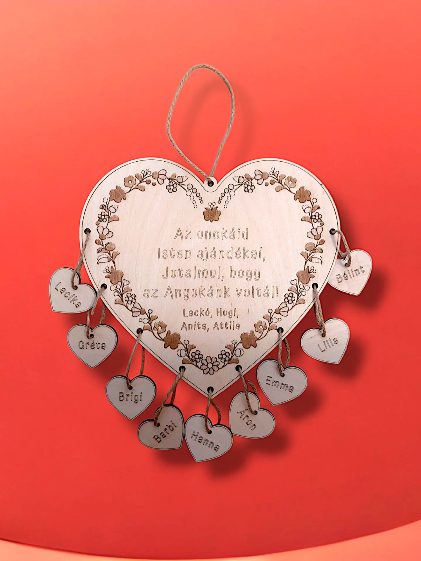 Lepd meg a nagymamát egy szívhez szóló, gravírozott ajándékkal! ✨ A fából készült pici szívekre az unokák neveit gravírozzuk, így egy örök emléket adsz ajándékba. A nagy szívben pedig a gyermekek neve is helyet kap.