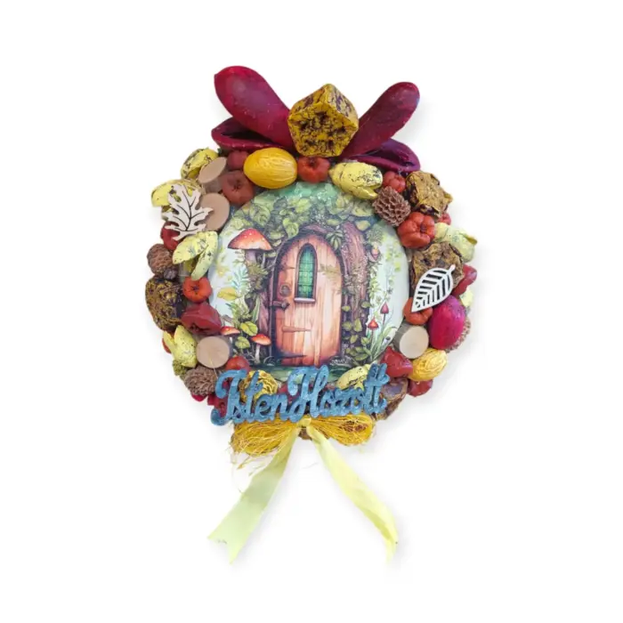 Ez a természetes és dekoratív ajtódísz tökéletes választás, ha szeretnéd megidézni az otthon meleg, barátságos hangulatát – akár a bejárati ajtón, ablakban vagy falon elhelyezve.