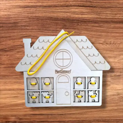 Fa fűzögetős fejlesztő játék – Ház alakban 23 cm mennyiség